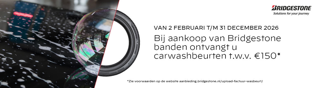 Bij aankoop van 2 of 4 Bridgestone zomer- all-season, of winterbanden ontvang je tot 12 gratis carwash e-vouchers ter waarde van € 75 tot € 150. De vouchers zijn inwisselbaar bij meer dan 200 geselecteerde wasstraten in Nederland. Zo rijd je veilig én houd je je auto of bedrijfswagen zichtbaar schoon wel zo prettig in het najaar en de winter.